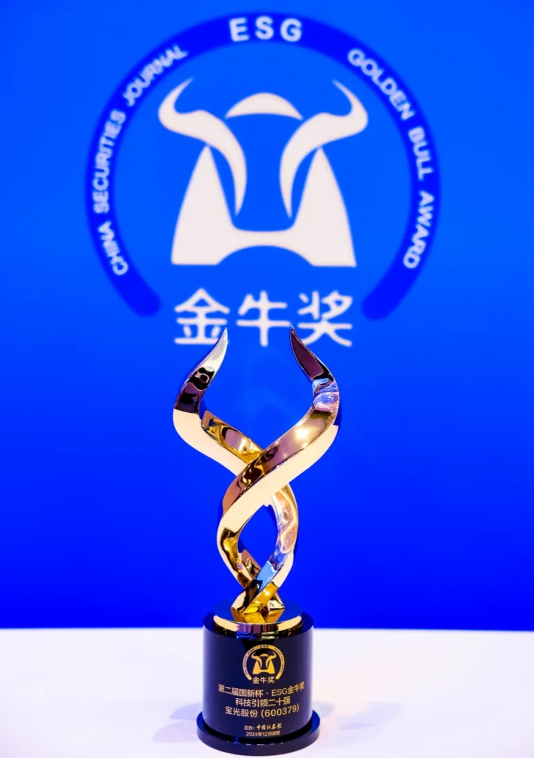 12月6日,由中國證券報和中國國新控股有限責任公司聯合主辦的2024金牛企業可持續發展論壇暨第二屆國新杯·ESG金牛獎頒獎典禮在上海隆重舉行。寶光股份憑借在科技創新、綠色發展和智能應用等方面的領先優勢,以及在推動行業轉型升級和ESG發展方面的積極作用,榮獲“2024年第二屆國新杯·ESG金牛獎科技引領二十強”獎項。