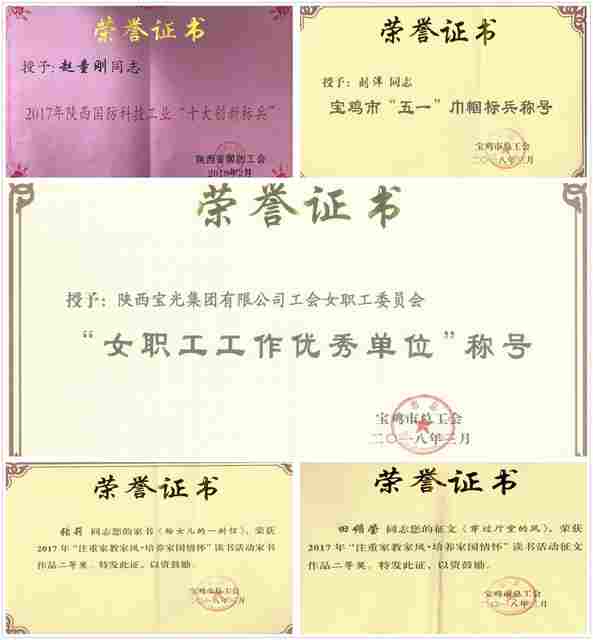 寶光集團(tuán)女工委榮獲寶雞市總工會(huì)女職工工作優(yōu)秀單位;精密陶瓷公司趙童剛同志榮獲陜西省國防科技工業(yè)“十大”創(chuàng)新標(biāo)兵;進(jìn)出口公司劉洋同志榮獲寶雞市“五一”巾幗標(biāo)兵;C產(chǎn)品制造部田媚瑩同志在寶雞市“注重家教家風(fēng) 培養(yǎng)家國情懷”讀書征文活動(dòng)中榮獲二等獎(jiǎng);A產(chǎn)品制造部張莉同志在寶雞市讀書活動(dòng)中榮獲家書作品二等獎(jiǎng)。